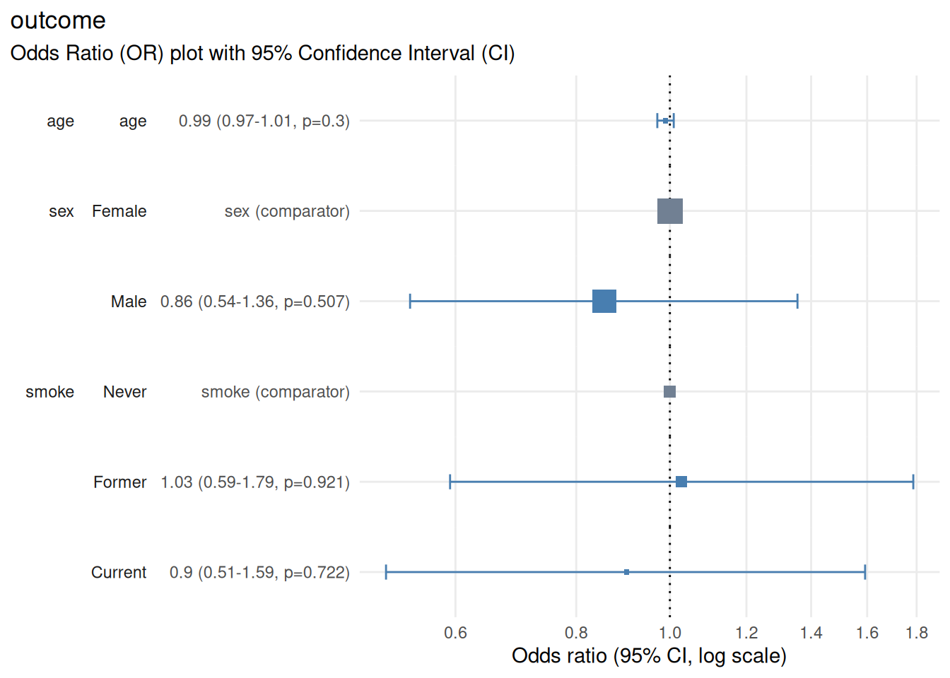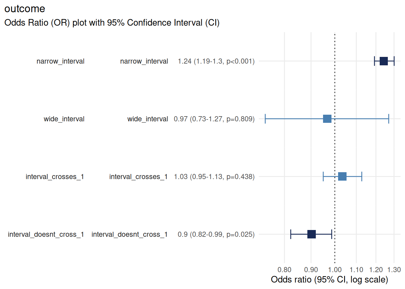 plot_or() transforms logistic regression results into intuitive, publication-ready forecast plots. By visualising odds ratios, confidence intervals and statistical significance together, it helps readers quickly grasp effect sizes and precision - making it an essential tool for communicating statistical findings effectively.